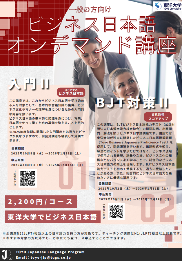 東洋大学オンライン日本語講座では、現在「2025後期ビジネス日本語講座(オンデマンド)」の受講生を募集しています。