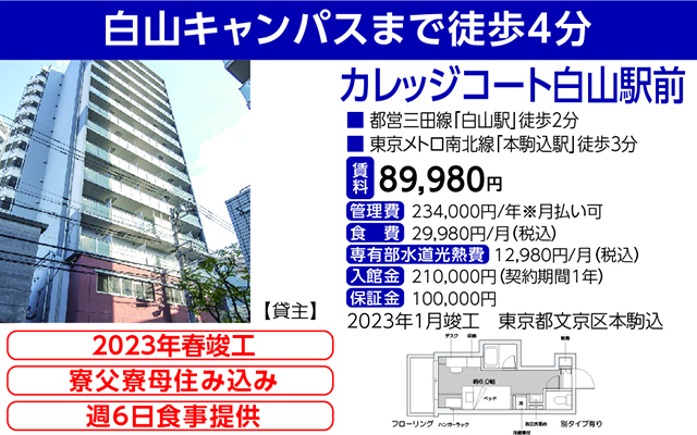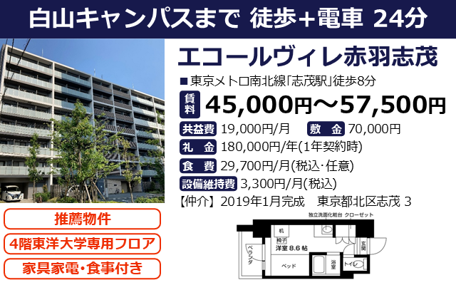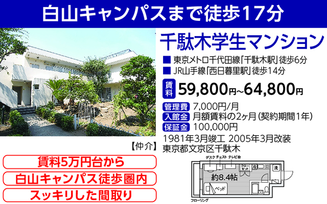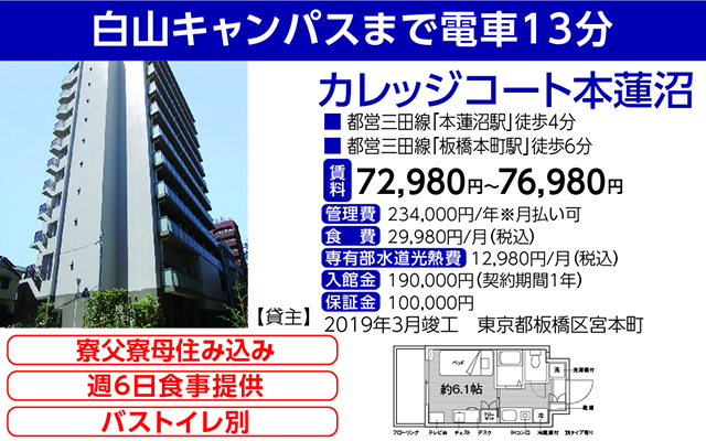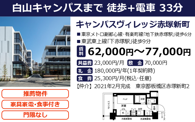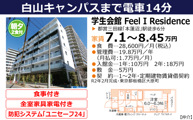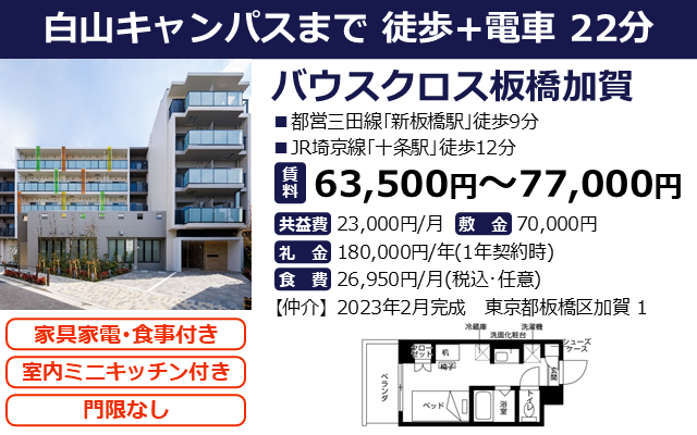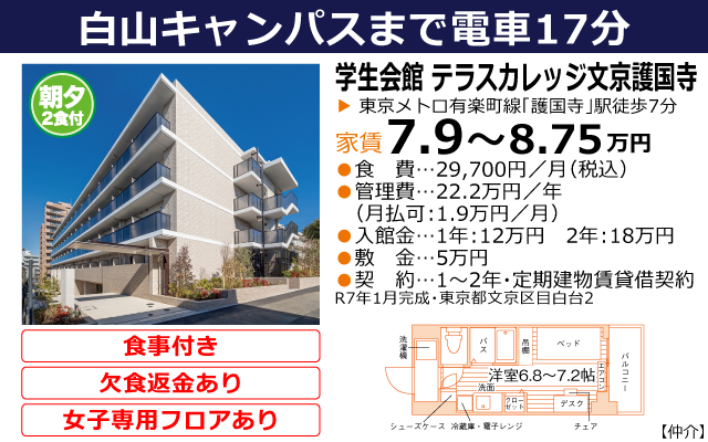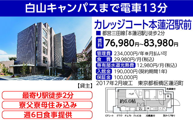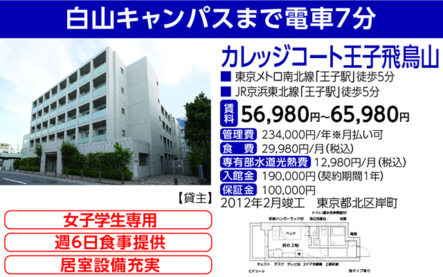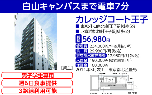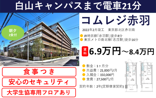 男子学生専用の食事付き学生マンション。白山・赤羽台両キャンパスまで乗り換えなしで通学できます。問合せ先: 株式会社毎日コムネット(学生マンション総合案内センター)