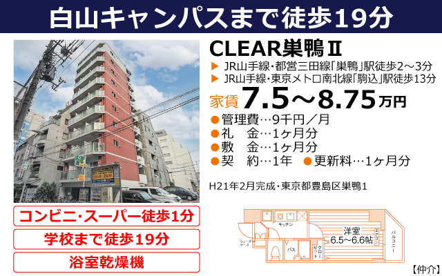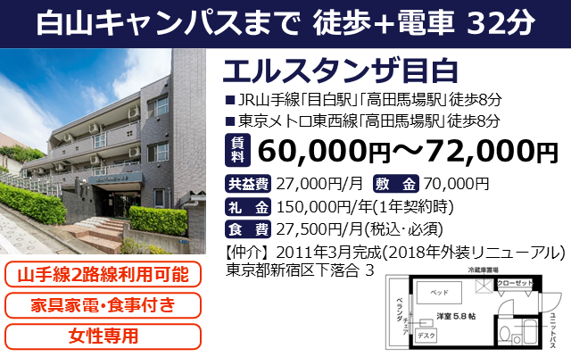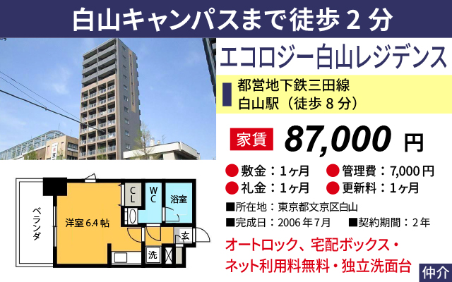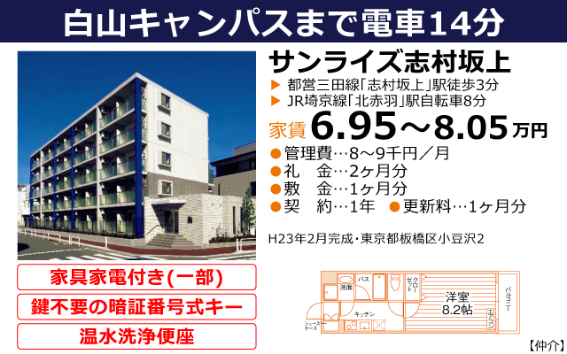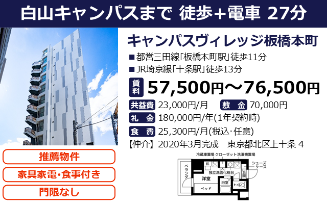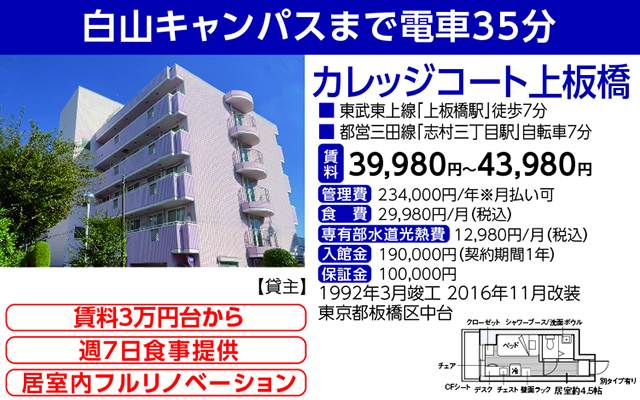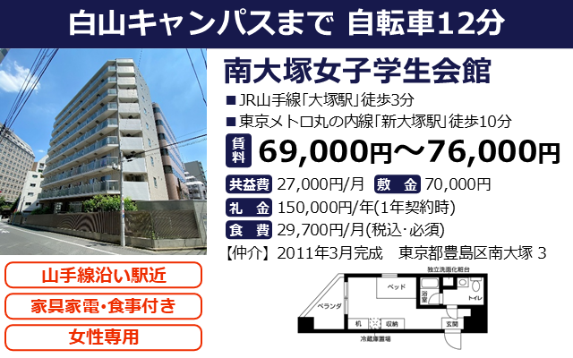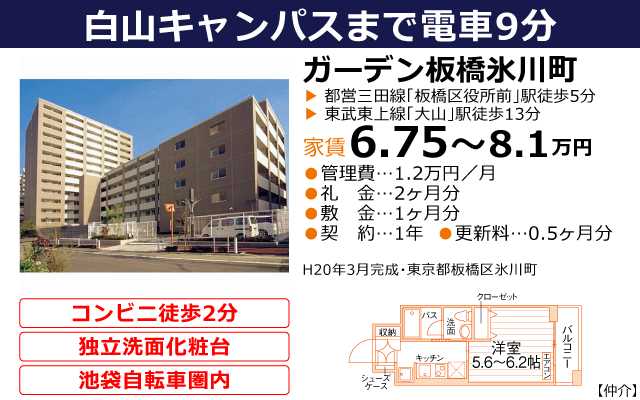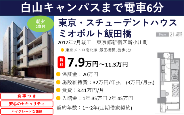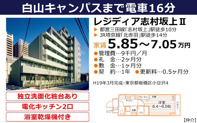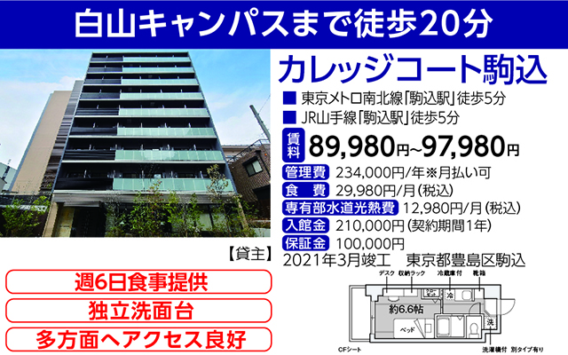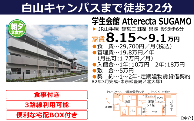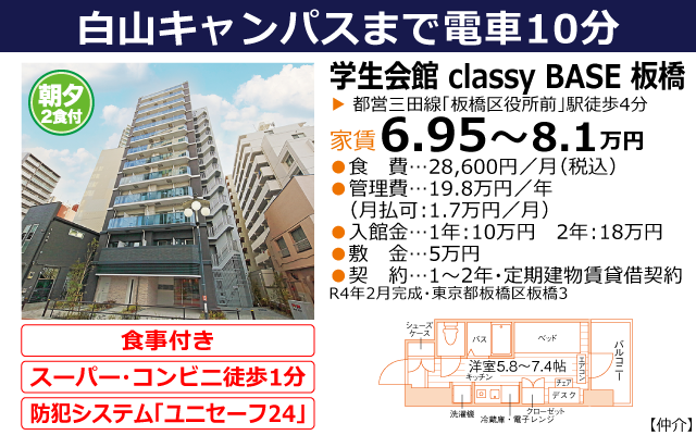 男子学生専用の食事付き学生マンション。白山・赤羽台両キャンパスまで乗り換えなしで通学できます。問合せ先: 株式会社毎日コムネット(学生マンション総合案内センター)