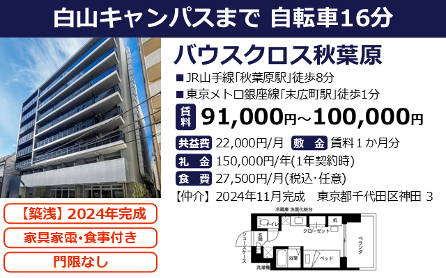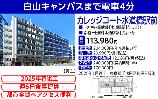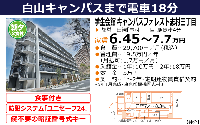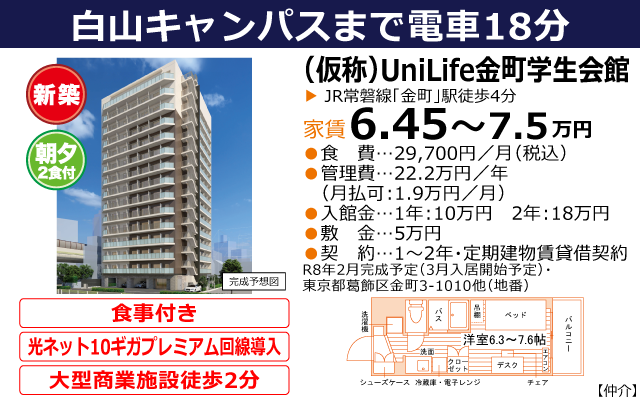 2025年春竣工、築1年の食事付き学生マンション。白山キャンパスだけでなく多方面へアクセス可能な立地なので、生活の幅が広がります。問合せ先: 株式会社毎日コムネット(学生マンション総合案内センター)