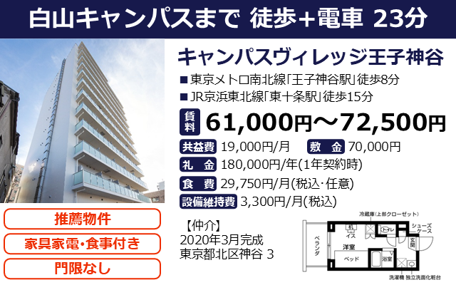 【東洋大学グローバルサービス株式会社推薦物件】礼金9万円オフ&仲介手数料50%オフ!食事付・家具家電付学生レジデンス。問合せ先: 株式会社学生情報センター(ナジック)