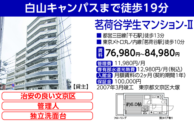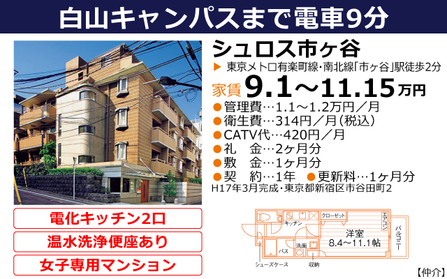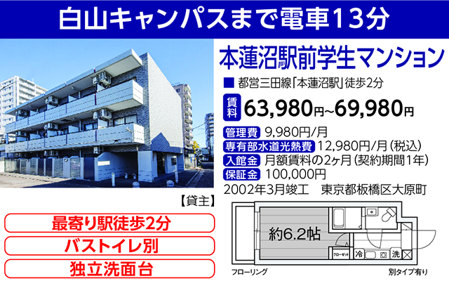 白山キャンパス徒歩圏内で家賃はなんと5万円代から!マンションの敷地内にはオーナーさんの住居もあり、安心できる環境です。問合せ先: 株式会社毎日コムネット(学生マンション総合案内センター)