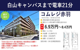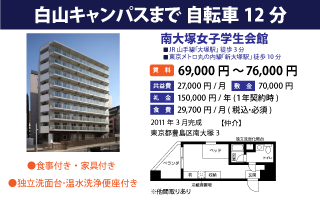 男子学生専用の食事付き学生マンション。白山・赤羽台両キャンパスまで乗り換えなしで通学できます。問合せ先: 株式会社毎日コムネット(学生マンション総合案内センター)