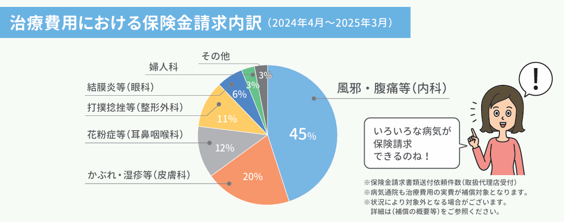 風邪やケガ等の治療費用や育英・学資費用の補償等