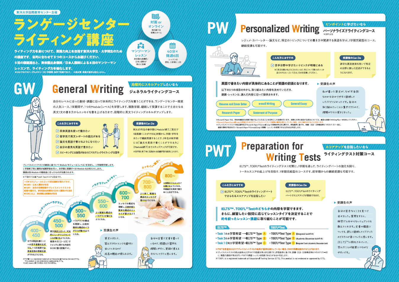 テスト対策のみとなりますので、総合的な英語力向上を目指す学生には、Conference WritingやThe PLUS Programの受講をオススメします。