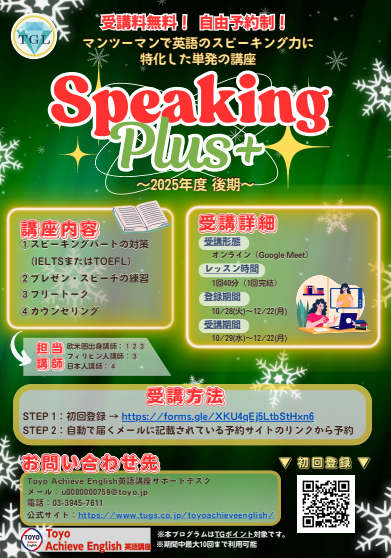 英語資格試験(IELTSまたはTOEFL)のスピーキングパートの対策やプレゼン・スピーチの練習、フリートークやカウンセリングなど、ご自身のニーズに合わせたスピーキングマンツーマン指導を受けられる1回完結型のスポット講座「Speaking Plus+」。長期留学出願時のプレゼン個別練習などにもきっちり対応し、無料で受けられる超人気講座です。