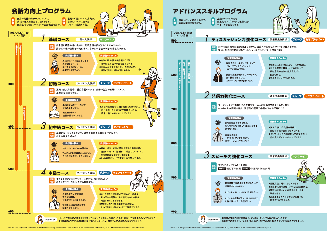 フィリピン人講師、日本人講師が担当する会話力向上プログラム(基礎コース、初級コース、初中級コース、中級コース)または欧米圏出身講師が担当するアドバンススキルプログラム(ディスカッション力強化コース、発信力強化コース、スピーチ力強化コース)から1コースお選びいただけます。